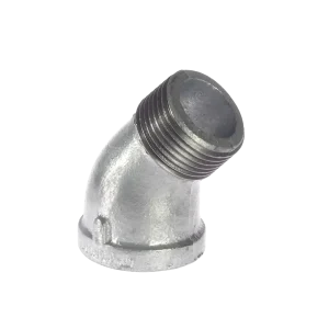 3.ข้องอเหล็กประปากัลวาไนซ์ 45° (ผ/ม) คือข้อต่อเหล็กชุบสังกะสีที่ใช้สำหรับเปลี่ยนทิศทางการเดินท่อให้ทำมุม45° โดยมีลักษณะเด่นที่มีปลายด้านหนึ่งเป็นเกลียวนอกและอีกด้านเป็นเกลียวในเพื่อความสะดวกในการเชื่อมต่อระหว่างท่อและข้อต่อชนิดอื่น